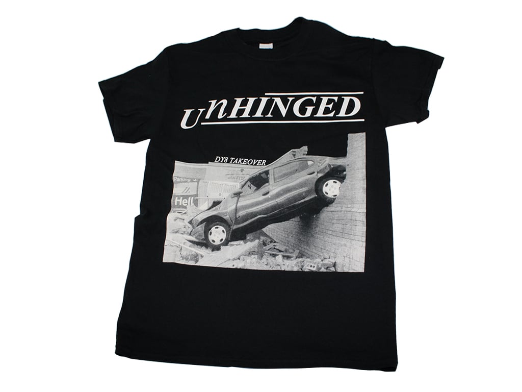 Classic Unhinged "DY8 Takeover" T-Shirt, printed on black Gildan Heavy tees.